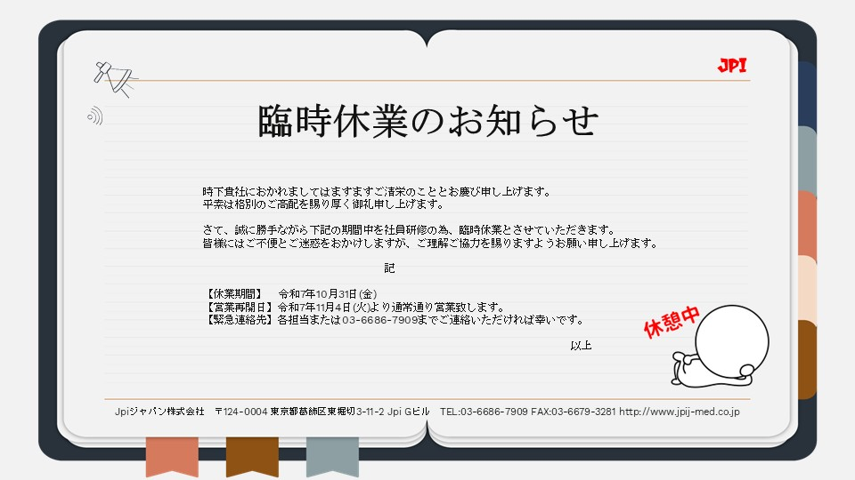 時下貴社におかれましてはますますご清栄のこととお慶び申し上げます。 平素は格別のご高配を賜り厚く御礼申し上げます。 さて、誠に勝手ながら下記の期間中を社員研修の為、臨時休業とさせていただきます。 皆様にはご不便とご迷惑をおかけしますが、ご理解ご協力を賜りますようお願い申し上げます。 記 【休業期間】 令和7年10月31日(金) 【営業再開日】令和7年11月4日(火)より通常通り営業致します。 【緊急連絡先】各担当または03-6686-7909までご連絡いただければ幸いです。 以上