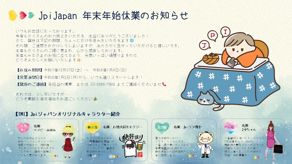 平素より格別のご愛顧を賜り、誠にありがとうございます。 誠に勝手ながら、弊社では下記の期間を年末年始休業とさせていただきます。 休業期間中はご不便をおかけいたしますが、何卒ご理解賜りますようお願い申し上げます。 【休業期間】令和7年12月27日(土)~ 令和8年1月4日(日) 【営業再開日】令和8年1月5日(月)より、通常通り営業いたします。 なお、休業期間中にいただいたお問い合わせにつきましては、営業再開後、順次対応させていただきます。 緊急のご用件がございましたら各担当者の携帯電話、または 03-6686-7909 までご連絡ください。 来年も皆さまのお役に立てるよう、スタッフ一同努めてまいります。今後ともどうぞよろしくお願いいたします。