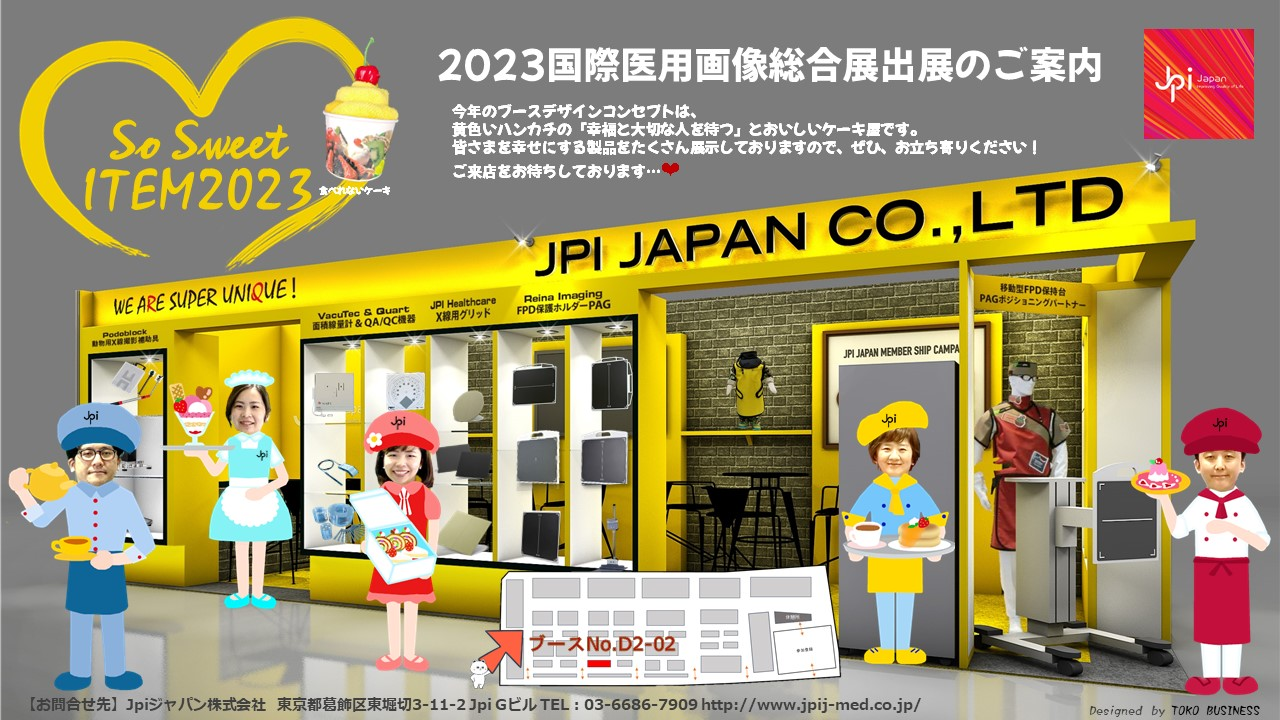 最近、東京では雨の日が続き、ちゃんとしたお花見はできませんでしたが、 皆様の地域ではお花見は楽しめられたでしょうか。 ところで、弊社は4月14日(金)~16日(日)にパシフィコ横浜展示ホールにおいて開催されます。 『ITEM2023(国際医用画像総合展)』の出展いたします。ブース№D2-02。 今年のブースデザインコンセプトは、 黄色いハンカチの『幸福と大切な人を待つ』とおいしいケーキショップ、 2つのテーマで、明るく黄色いケーキショップにしてみました。 主要展示品 ・両肩から腰までを一度の照射で撮影できる繋ぎ目がない中尺グリッド ※展示品サイズは480x640mm。670×670まで製作可。 ・耐久性が高く繋ぎ目が少ないカーボンカバー長尺グリッド ※展示品サイズは585x940mm。670×1340mmまで製作可。 ・17インチでもぐらつかない移動型FPD保持台「PAGポジショニングパートナー」 ・一度着たら忘れられない軽さの超軽量エプロン「クリプトライト」 ・防護力が高い鉛ガラスを使用したX線防護眼鏡「Xガードシリーズ」 ・高価なFPDを損傷から守る!FPD保護ホルダー「PAG」 ・高精度の線量管理を可能にする面積線量計「VacuDAP」 ・被ばくゼロの照射野測定器「Quart Nonius」 ・オンリーワンの競走馬X線撮影補助具!「Podoblock」 それから、JIRA企画プレゼンテーションにも参加いたします。 ★4/14(金) 11:35-11:45 企業プロモーション「Jpiジャパン会社紹介」 ★4/15(土) 13:00-13:15  特定テーマ: 放射線管理/放射線防護放射線管理・放射線防護 炭を使用した消臭裏地『UniTex360°』 今回は、パートナー社JPIヘルスケアとVacuTec社からも参加を予定しておりますので、 グリッドや面積線量計についてご疑問点がある方はメーカー側とのお打合せも設定できると思います。 ご招待カードをご希望の方は,お送りいたしますのでご連絡ください。  それでは、久しぶりに皆様にお会いできることを楽しみにしております。2023/4/5Jpiジャパン㈱
