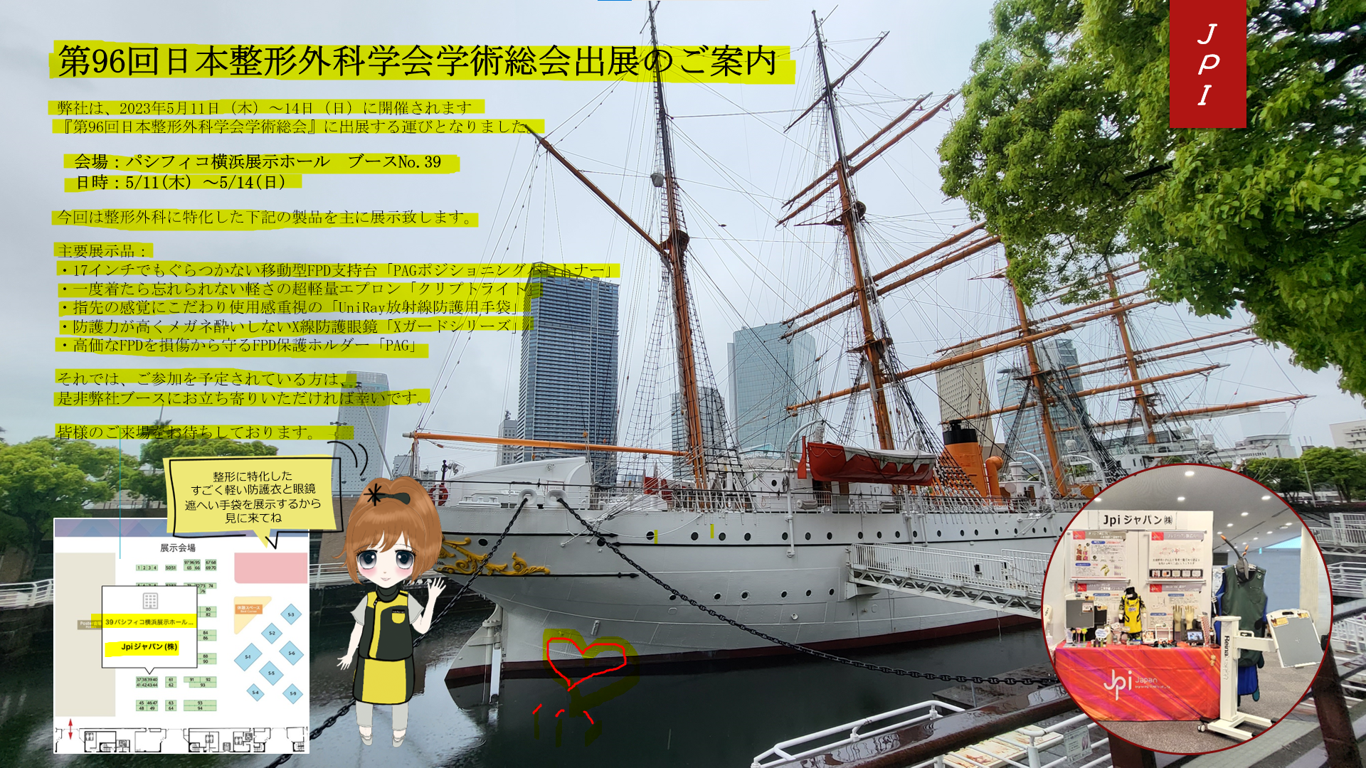 2023年5月11日(木)~14日(日)に開催されます『第96回日本整形外科学会学術総会』に出展する運びとなりました。 会場:パシフィコ横浜展示ホール ブースNo.39 日時:5/11(木) ~5/14(日) 今回は整形外科に特化した下記の製品を主に展示致します。 主要展示品: ・17インチでもぐらつかない移動型FPD支持台「PAGポジショニングパートナー」 ・一度着たら忘れられない軽さの超軽量エプロン「クリプトライト」 ・指先の感覚にこだわり使用感重視の「UniRay放射線防護用手袋」 ・防護力が高くメガネ酔いしないX線防護眼鏡「Xガードシリーズ」 ・高価なFPDを損傷から守るFPD保護ホルダー「PAG」 それでは、ご参加を予定されている方は、是非弊社ブースにお立ち寄りいただければ幸いです。 皆様のご来場をお待ちしております。 2023/5/11 Jpiジャパン㈱