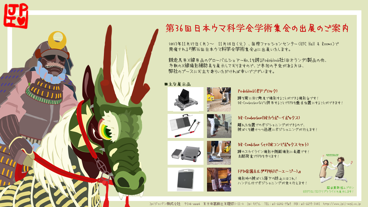 弊社は、2023年11月27日(月)~ 11月28日(火) 国際ファッションセンター(KFC Hall & Rooms)で開催される『第36回日本ウマ科学会学術集会』に出展いたします。 競走馬用X線用品のグローバルシェアーNo.1を誇るPodoblock社(@オランダ)の製品の他、多数のX線撮影補助具を展示しておりますので、ご参加の予定がある方は、ぜひ一度弊社のブースにお立ち寄りいただければ幸いでございます。 ■主な展示品 Podoblock(ポドブロック) 蹄を常に同じ角度で撮影することができる撮影台です! DR-Cowboyboxなどと併用することでFPDを垂直位置にすることができます! DR-Cowboybox(DRカウボーイボックス) 離れた位置でのポジショニングができるので、被ばくを避けつつ迅速にポジショニングが行えます!   DR-Combibox Set(DRコンビボックスセット) 蹄のスカイライン撮影や側面撮影に最適です! 高耐荷重でFPDを守ります! FPD保護ホルダ『PAG(ピーエージー)』 撮影時の被ばくと落下の防止にはこれ! ハンドル付でポジショニングが楽々行えます! その他、ご好評をいただいている超軽量防護エプロンKRYPTOLiTE(クリプトライト)も展示いたします。 2023/11/22 Jpiジャパン㈱