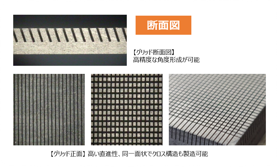 - It is ideal for mammography and angiography, which require delicate images. Since we can manufacture grids with up to 135 lines, it can also be used in applications requiring strict precision, such as tomosynthesis. Furthermore, by using high-density grids with 100 or more lines, the grid can be used without vibration, preventing noise issues caused by the vibration system of mammography devices.
