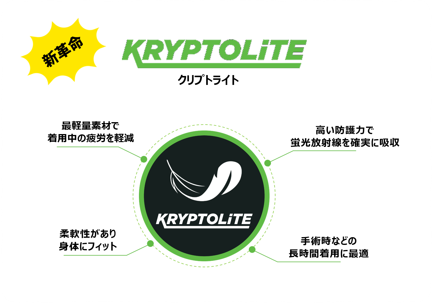 KRYPTOLiTE, a lead-free material, was developed through a joint venture with Germany using a patented chemical formulation. KRYPTOLiTE possesses an extremely high PWR (Protection-to-Weight Ratio) and, through its multi-layered structure technology, absorbs both fluorescent radiation and backscattered radiation, providing users with optimal safety.