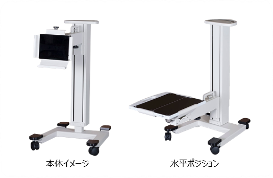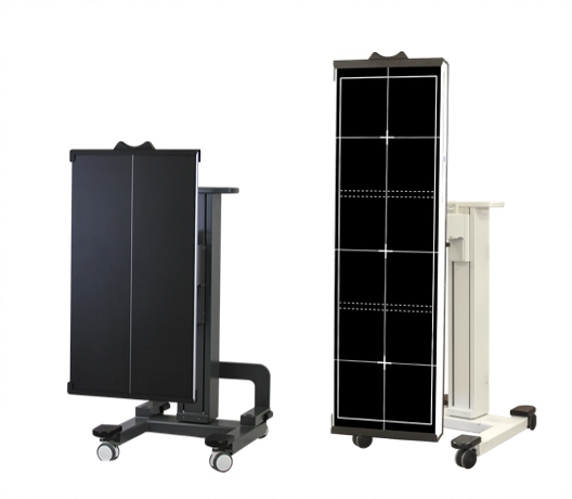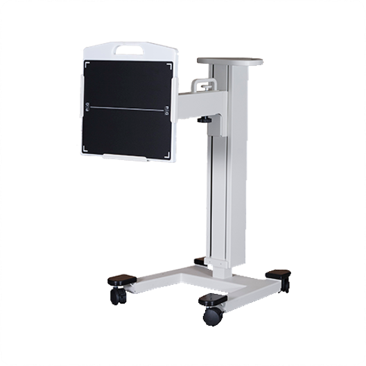 This is a mobile support stand designed for medium- and long-length flatpanels. It securely holds large, heavy medium- and long-length panels, enabling stable imaging of a wide range of areas from the spine to the ankles. Additionally, the imaging unit can be positioned vertically, horizontally, or in a horizontal plane, allowing for flexible adaptation to various positioning scenarios—including standing positions for the chest, spine, and lower limbs, as well as lateral and supine positions.