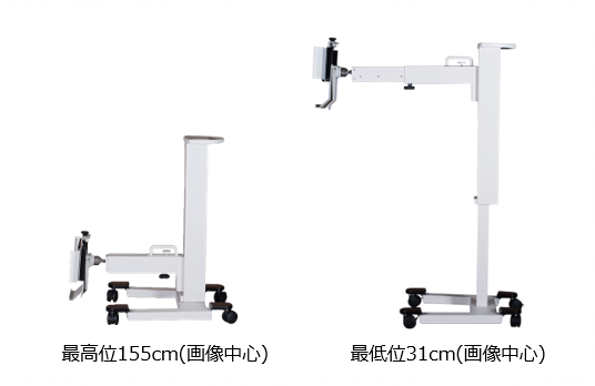 weight of just 39 kg, it moves smoothly even in operating rooms with numerous cables. The height is adjustable from 310 mm to 1550 mm (image center), and the angle of the imaging area can be freely fixed.