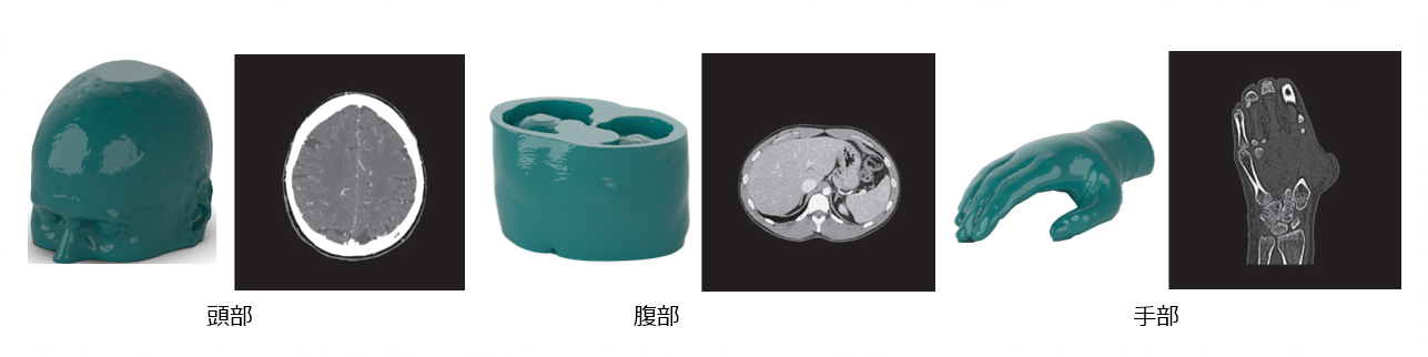 These are human phantoms for CT imaging, created using the latest technology based on actual patient data. All tissues are accurately represented in realistic Hounsfield units during 120 kVp CT imaging.