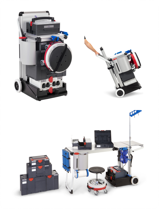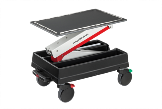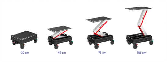 It features gas springs for smooth height adjustment. Equipped with a handle, it is easy to move and transport, and equipment can be stored in the lower storage compartment.