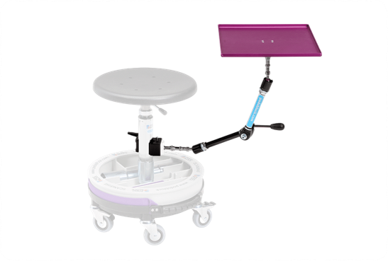 The SCANdroid FlexTray is a tray with a flexible arm that can be attached to the SCANdroid. It can be mounted on almost any circular or flat surface, such as the stool’s legs, and can be adjusted to the user’s preferred position.