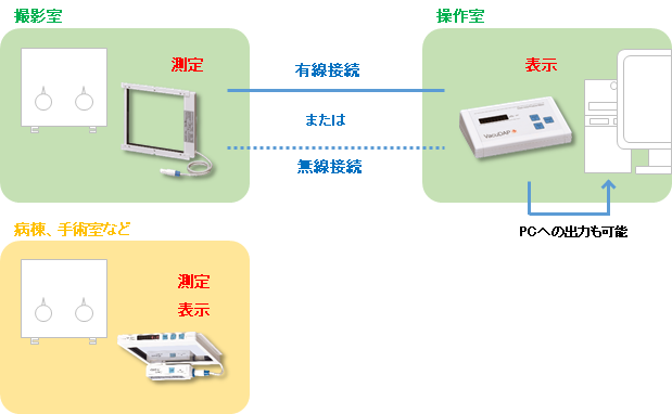 特に、VacuDAP Bluetoothモデルなら配線の手間が要らないのでケーブル工事無しで表示器と無線接続可能です。また、電源確保の難しい回診撮影装置でも、VacuDAP compactモデルなら、バッテリー駆動なので、病棟や手術室の撮影時にも線量測定できます。