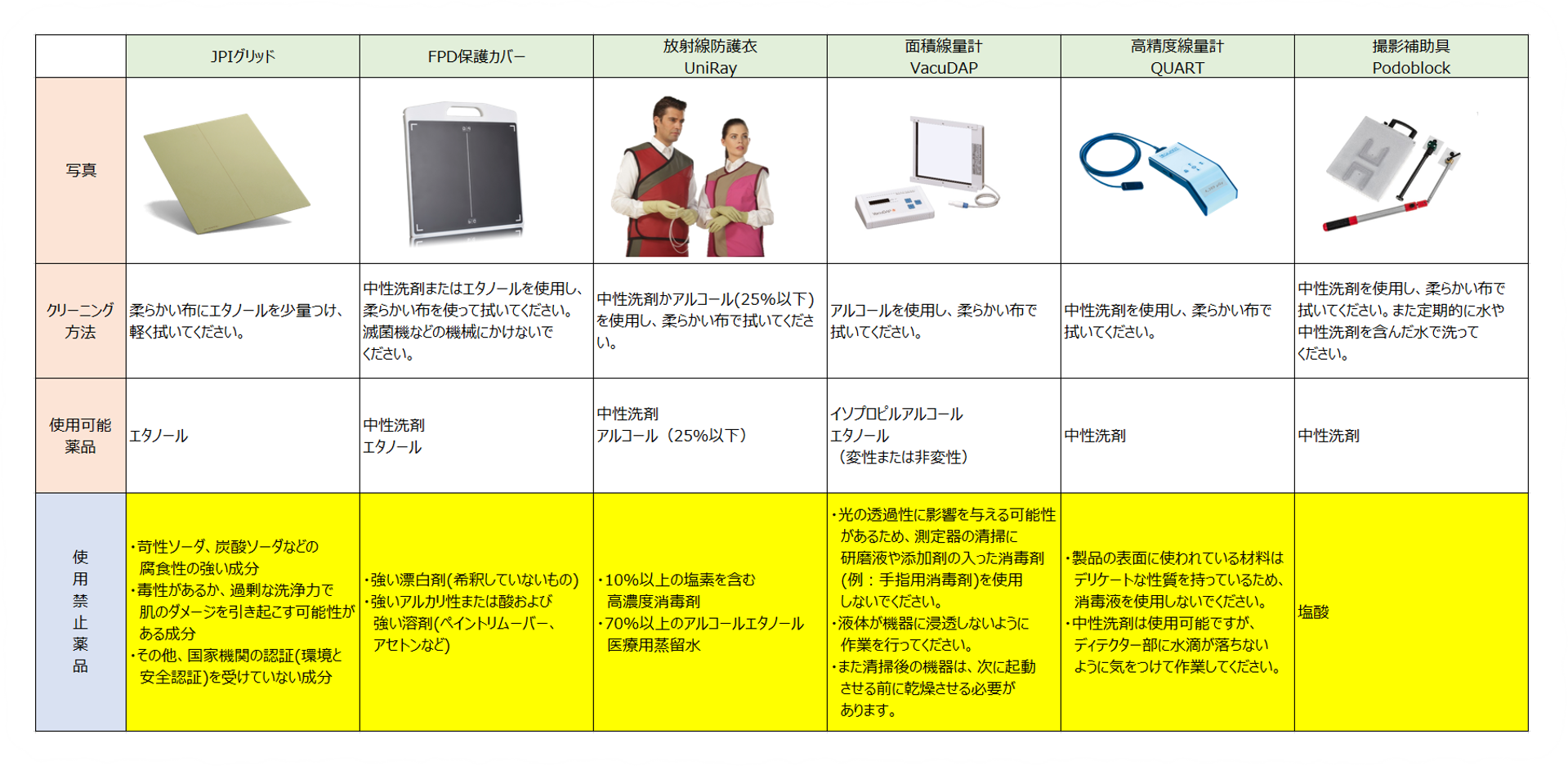 製品クリーニング方法の詳細は下記表をご参照ください。