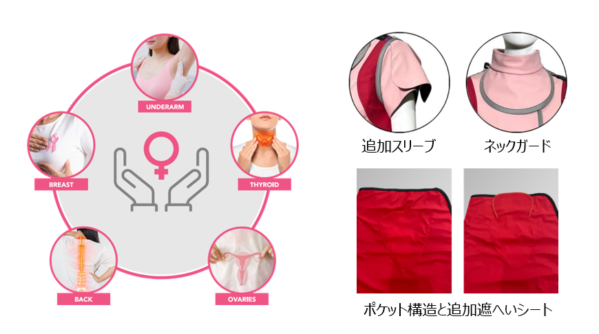 ・袖の追加、側面の延長、脇下の追加カバーで腋窩リンパ節、肩関節、骨髄までを防護。